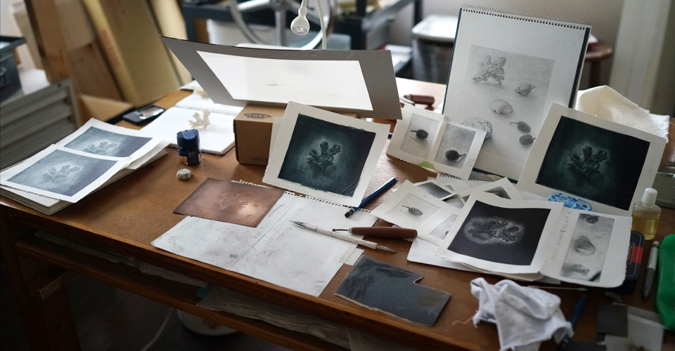 メゾチントは目立てをした銅版をスクレーパーやバニッシャーという道具を用いて、
