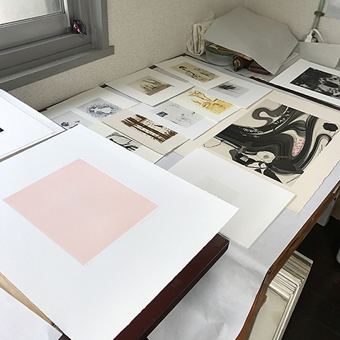 銅版画体験では、はじめに私が刷りを担当した作家の方々の作品を手に取ってご覧いただいています。